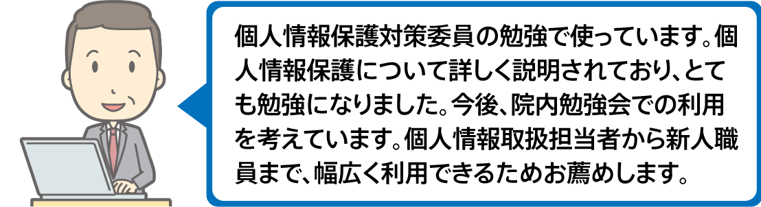 最初に取り組む必要があるのは①ですが、では、どのように学べばよいでしょうか。そして、外部への委託、外部からの受託、派遣の業務と、職員の出入りの多い保健医療機関において、どのように全職員に徹底すればよいでしょうか?