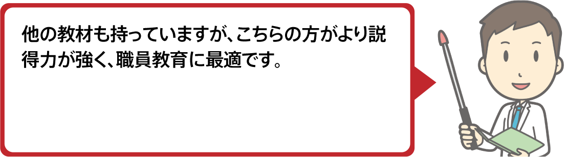 音声付きの資料スライドや図表等の関連資料がセットになったパッケージで、医療機関内の職員の初期導入教育及び定期の集合・個別教育だけでなく、医師・コメディカル人材を育成する教育機関での基礎的教育などにご活用いただけます。